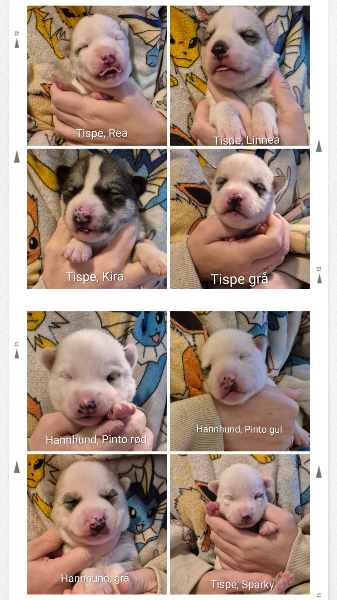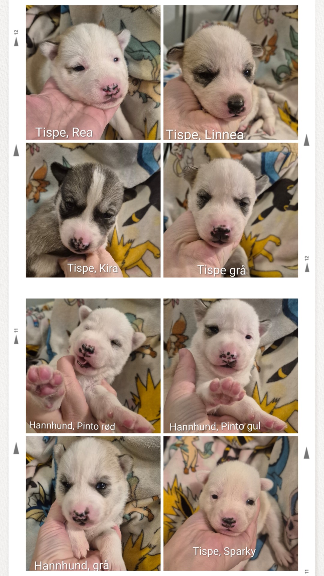 Alle valpene har lagt fint på seg, selv om noen spiser mer enn andre. Roxy er en kjempeflink mamma som faktisk synes det er greit at vi koser litt med valpene, så lenge hun også får kos samtidig. Hun har funnet ut at vi har VOM i fryseren nede, og selv om hun har tørrfor tilgjengelig hele tiden, kommer hun rett som det er ned for å få en bit med frossen VOM som hun kan spise på valpe rommet. Valpene har fått egne farger, men ikke helt bestemt hvem som heter hva ennå. Dette kullet har som de før eget tema og denne gangen har vi valgt å virkelig hente frem barnet i oss selv. The Pokemon Center har erklært 2025 som 'The year of the Eevee' og da måtte jo valpene få navn etter Eeveelutions. Rea (Glaceon), Linnea (Leafeon), Kira (Sylvion), Sakura (Espeon), Pyro (Flareon), Mikey (Eevee), Tamao (Umbreon), Sparky (Jolteon).