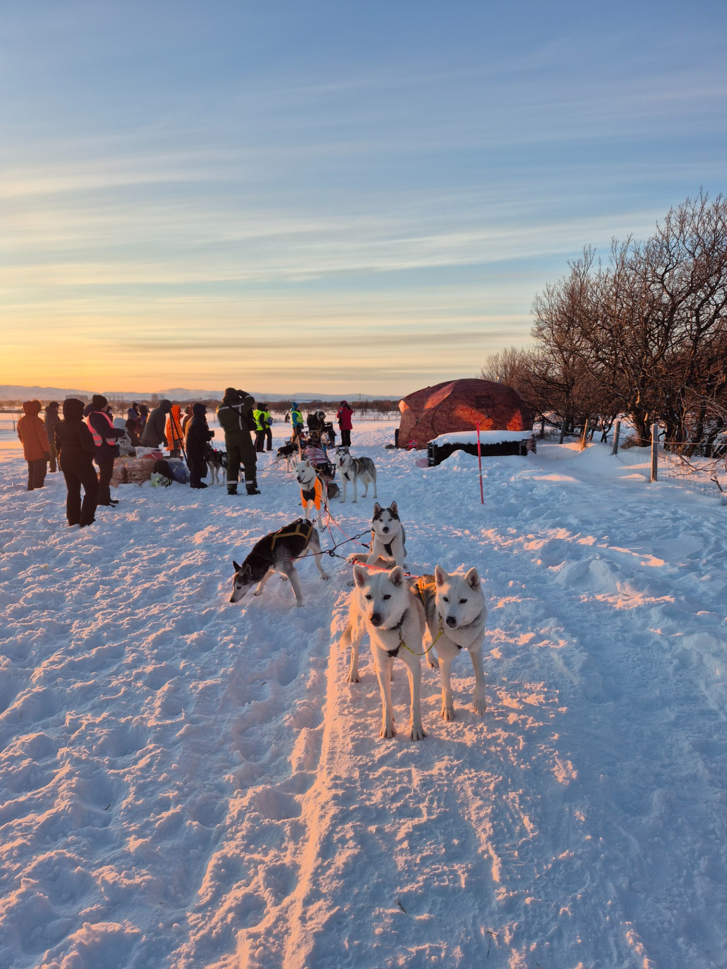 Påkledning av kjørerklær er alltid interessant. Man føler seg som en teletubby med alle lagene. Vi hadde glemt å lade batteriene til sokkene, så de kom nok til å slutte å fungere før 2.etappe var ferdig. Litt irriterende, men la oss være ærlige om at det ikke er normalt for sokker å måtte lades så det var en naturlig forglemmelse. Sko-tørkeren hadde gjort jobben sin så sko og sokker var tørre og varme. Vi kunne høre hundene på sjekkpunktet og de var svært misfornøyde med at de andre spannene fikk gå og de måtte være igjen. Vi fikk av dem dekkenene og tok en sjekk. Ingen stive hunder og alle var helt klare til å kjøre. De fikk vann før vi startet å sette på bakliner.