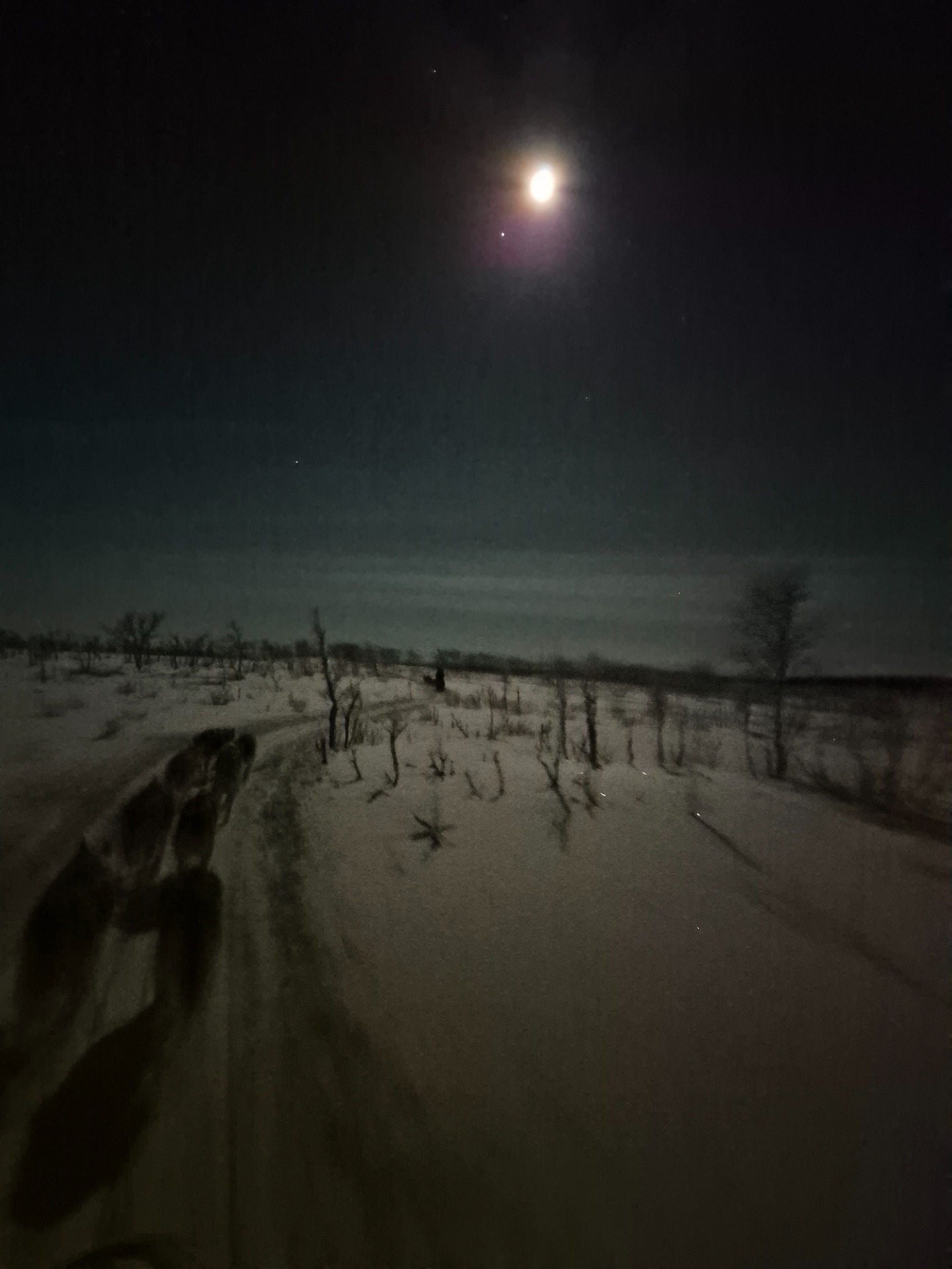 Sledesjekken gikk veldig bra og vi fikk til og med kompliment fra TD over vel organisert elektronikk bag. Andreas hadde insistert på at vi skulle ha lys på sleden, så disse ble også slått på. Starten er alltid det vi er mest nervøse for. Hundene var spinnville og Andreas kjørte dem opp til startstreken. Carina prøvde å stå på bak men det gikk ikke like bra og hun måtte pent gå selv. Oppe ved start hadde vi 9 min til start, men løpsleder var der og bestemte at vi skulle bare kjøre så vi slapp å stå å holde igjen hundene. Flere spann etter Carina startet også før 23:00.