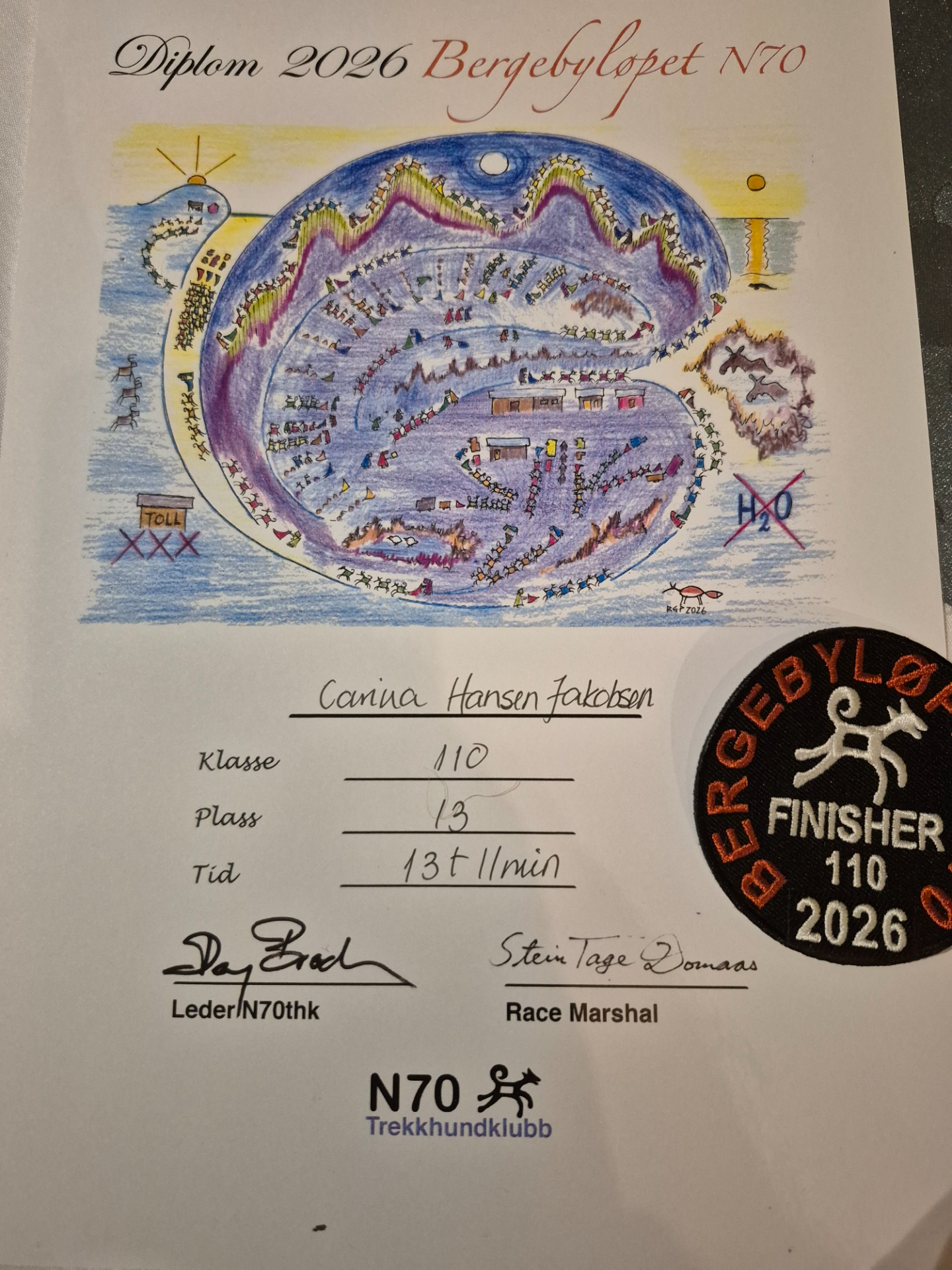 Vi hadde en fantastisk løpsopplevelse. Været var nydelig og selv med kraftig vind på snaufjellet hadde vi et supert løp. Vi er kjempestolte av hundene som gjorde en fantastisk innsats og er strålende fornøyd med plassering og kjøretid. Carina skulle bare fullføre, og alt annet var en bonus. Og bli 2.beste RNB spann var en positiv overraskelse og topp 15 av 20 startende var heller ikke noe vi forventet. Neste løp er TromsQuest og da er det Carina som skal ut med 8-spann og 60km.
