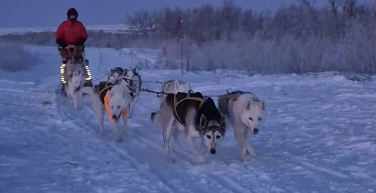 Rett før sjekkpunktet kom det et spann i møte. Eller det var det Carina trodde. Hundene i spannet hadde tatt feil i et kryss. De hadde kjørt ned på veien i stedet for å krysse. Kjører hadde klart å stoppe men nå hadde hun bare kaos i spannet og en slede som sto helt feil vei uten ankerfeste. Carina kom seg forbi og satte straks ned begge ankrene for å hjelpe. Noen minutter med knoting etter så var sleden på rett kjøl, med ankerfeste, og hundefloken var rettet delvis opp. Hunden til Carina begynte nå å bli utålmodige og vi vet av erfaring at de drar fint av gårde med sleden og 2 anker nede om de virkelig vil. Etter en kjapp samtale med den andre kjøreren hoppet Carina på sleden og kjørte videre.
